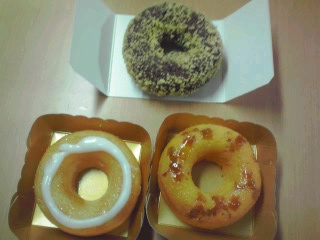 で、ついでに近くのミスタードーナツで新作の焼きド二種類と普通のドーナツ買ってきた。