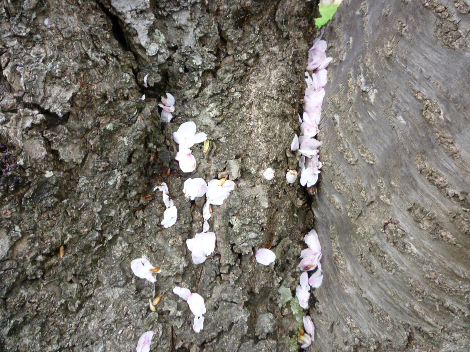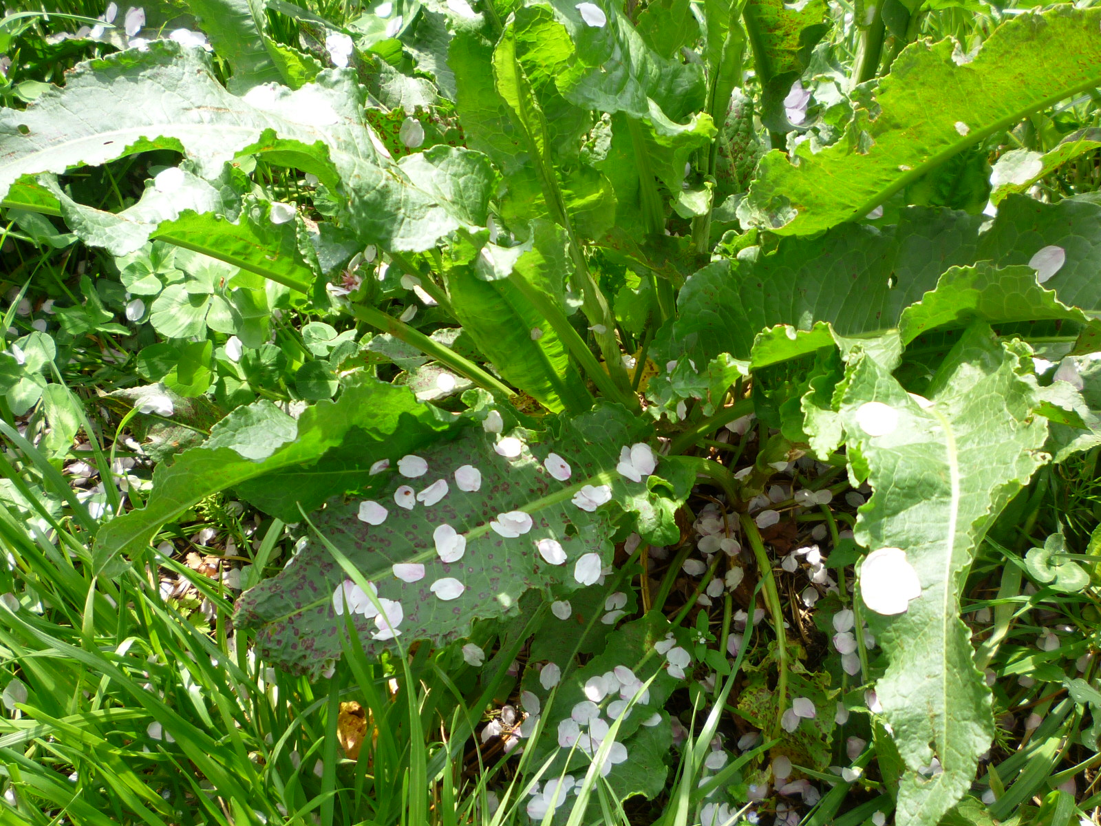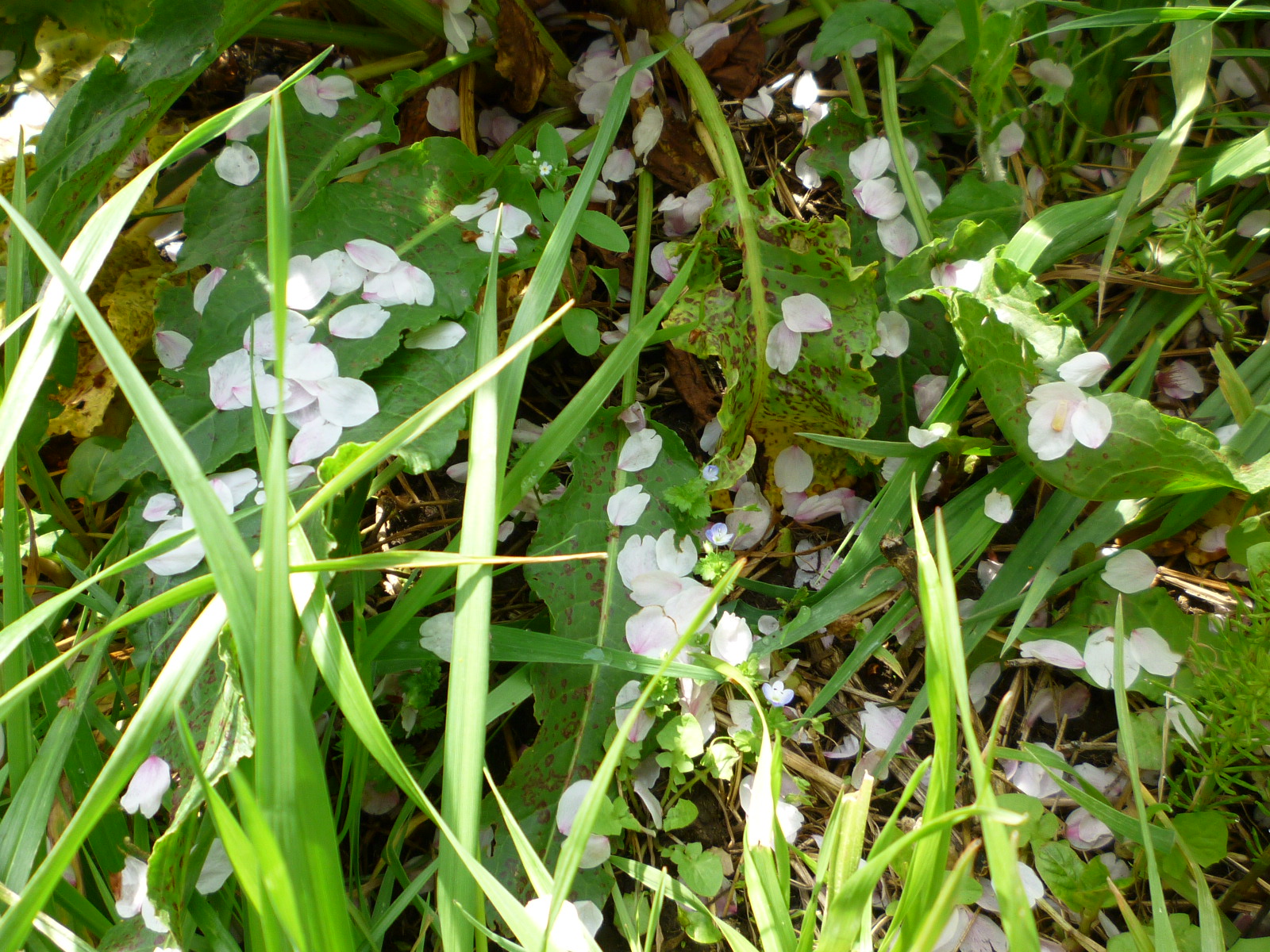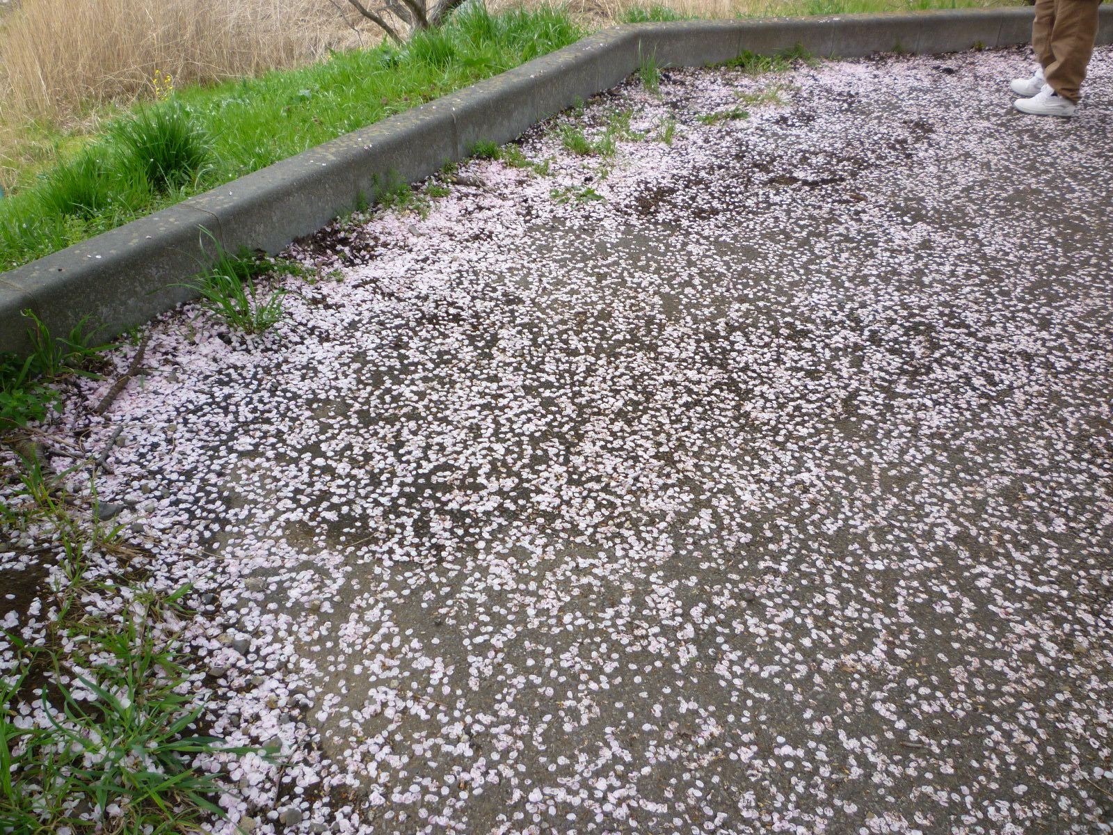 道端の雑草の上にも、桜の花びらたくさん。