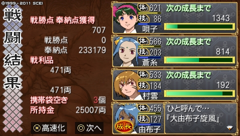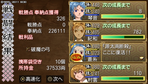 とか思いながら試しに琴音と紀和と亮子と村雲で行ってみたら、壱与姫は手に入るしなんかそこらへんでいい感じの武具は手に入るし、ちょっと収獲多くてクリアもリセットも出来なくなっちゃってそのまま進めた。
